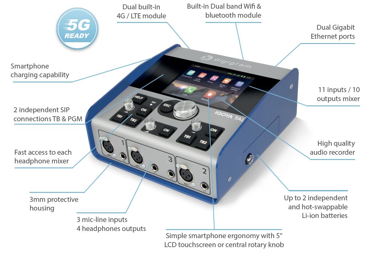 Portable codec with LCD touch screen and 3x Mic input, 4x Phones out, 2x XLR I/O with Ethernet, WiFi and Cellular connections